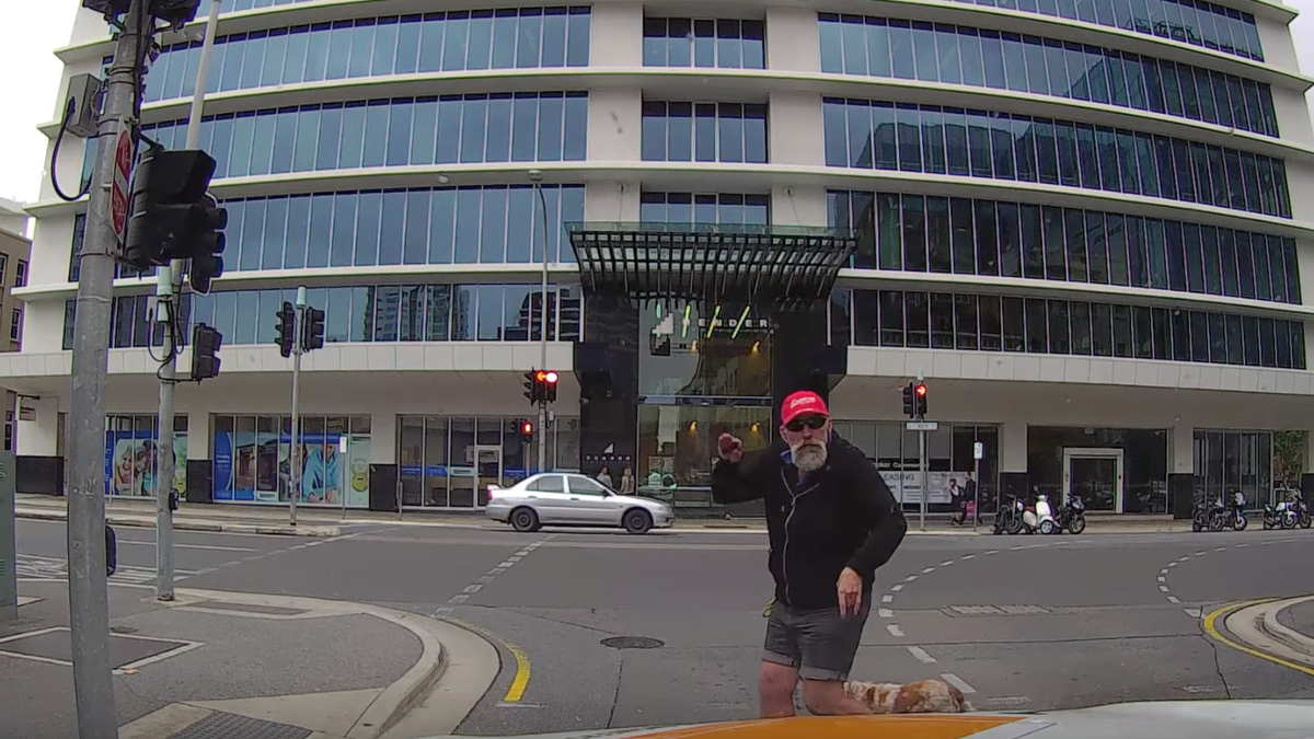 A driver who did nothing wrong infuriated a man crossing the street with his dog, but the pedestrian became so focused on making angry gestures at the car that he didn't see he was about to be served up some karma.