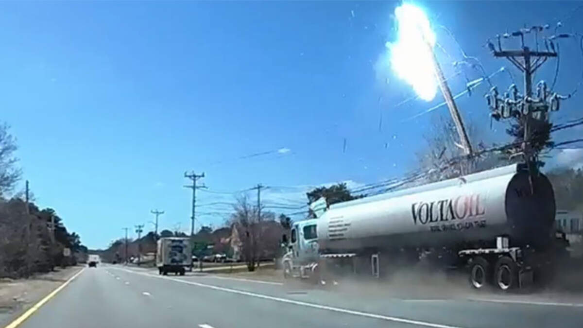 BOURNE, MA (WBZ-AM) -- A dashcam video released by police in Bourne, MA shows a VoltaOil tanker truck filled with12,000 gallons of unleaded gas drive off the road and hit a utility pole.