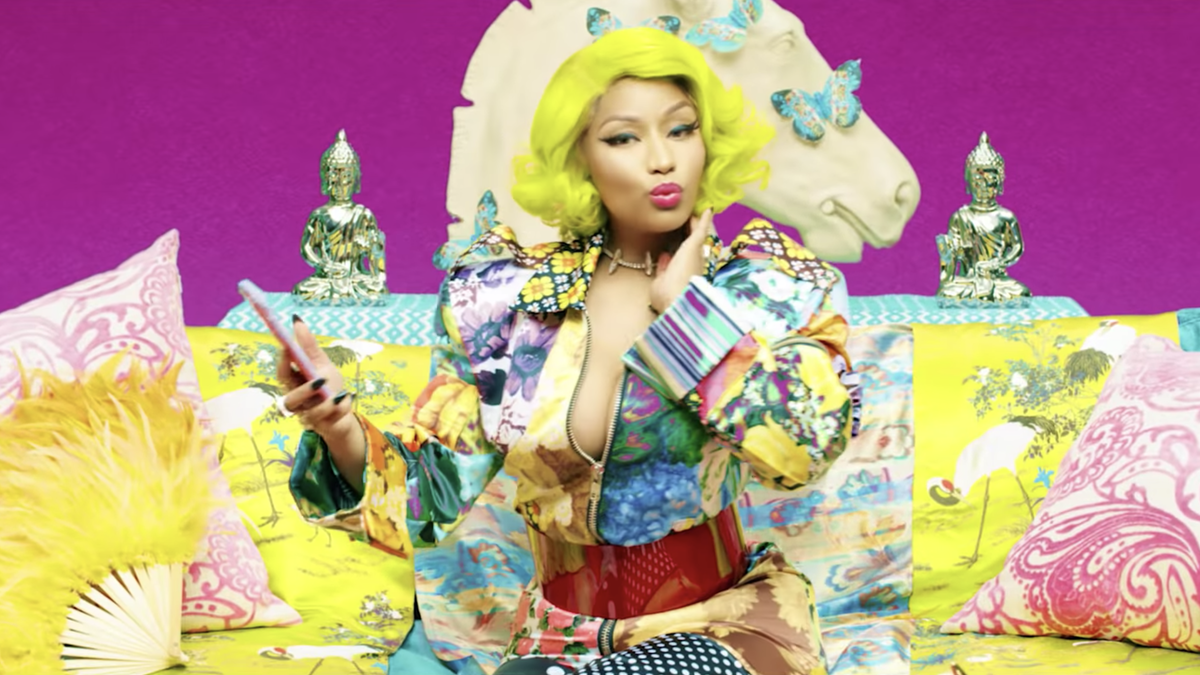 Donning a neon yellow wig, Minaj lounges in luxury during her verse, waving the same feathered fan previously held by Jimin and taking selfies. While she raps in english, the words appear behind her written in hangul, the Korean writing system.