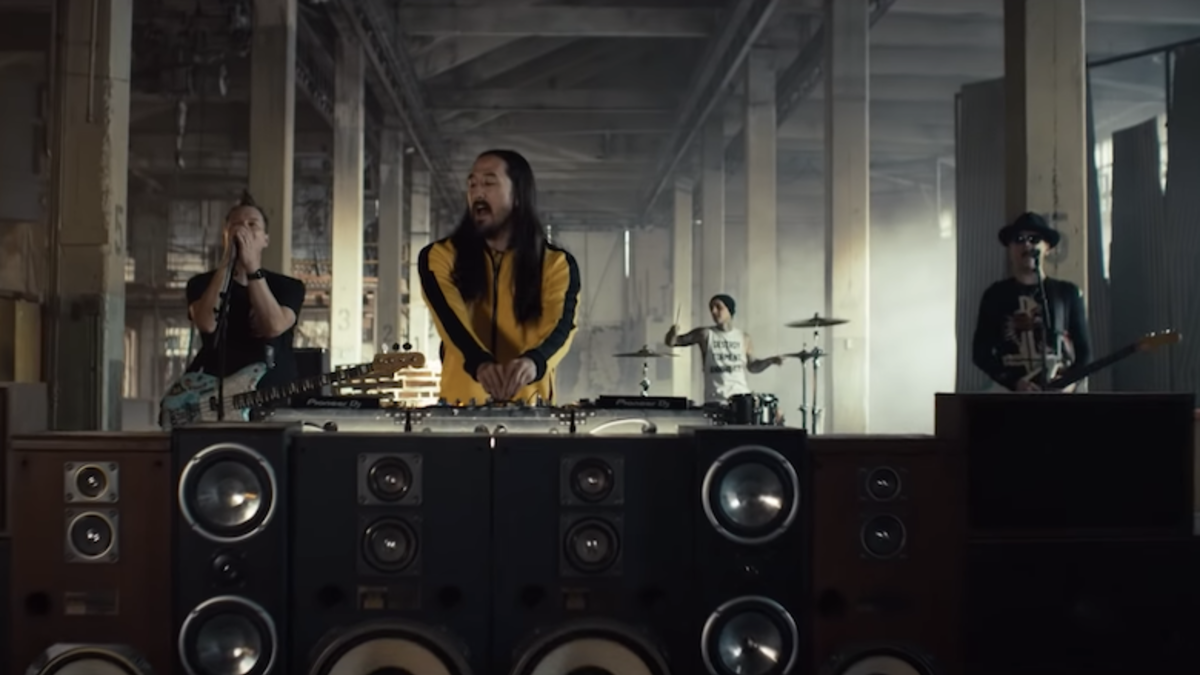 On Thursday (March 14), the DJ/producer and pop punk veterans shared the song's video. In the visuals, the band enthusiastically plays in a warehouse while Aoki jumps around, twisting and turning the knobs of his turntable. The clip cuts from performance footage to a young couple destroying a bunch of old appliances in a junkyard, giving a literal meaning to the word "broken."