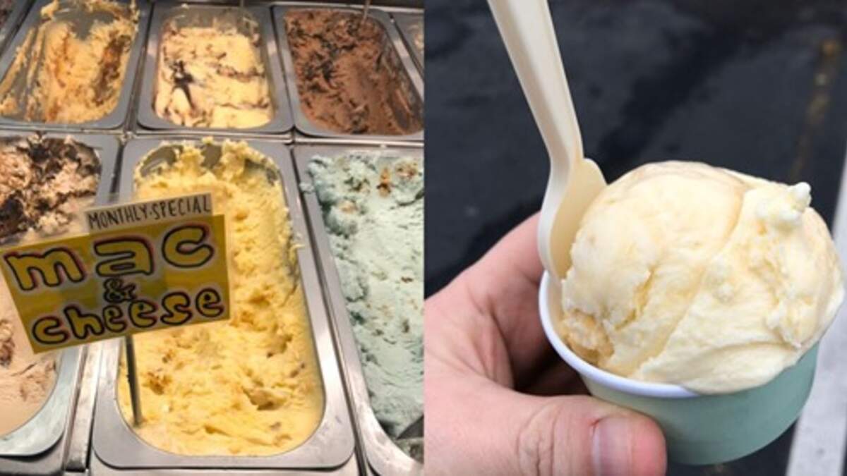 This guy a photo of the sign for Mac and cheese ice cream with the simple caption "this is ice cream annnnnnd should I try it?"