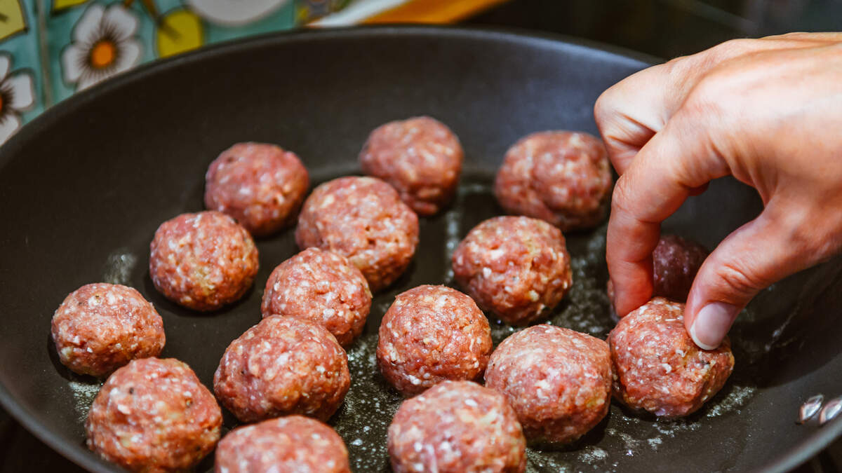- In a frying pan, heat oil on medium heat. When hot, gently add your meatballs and brown on all sides.