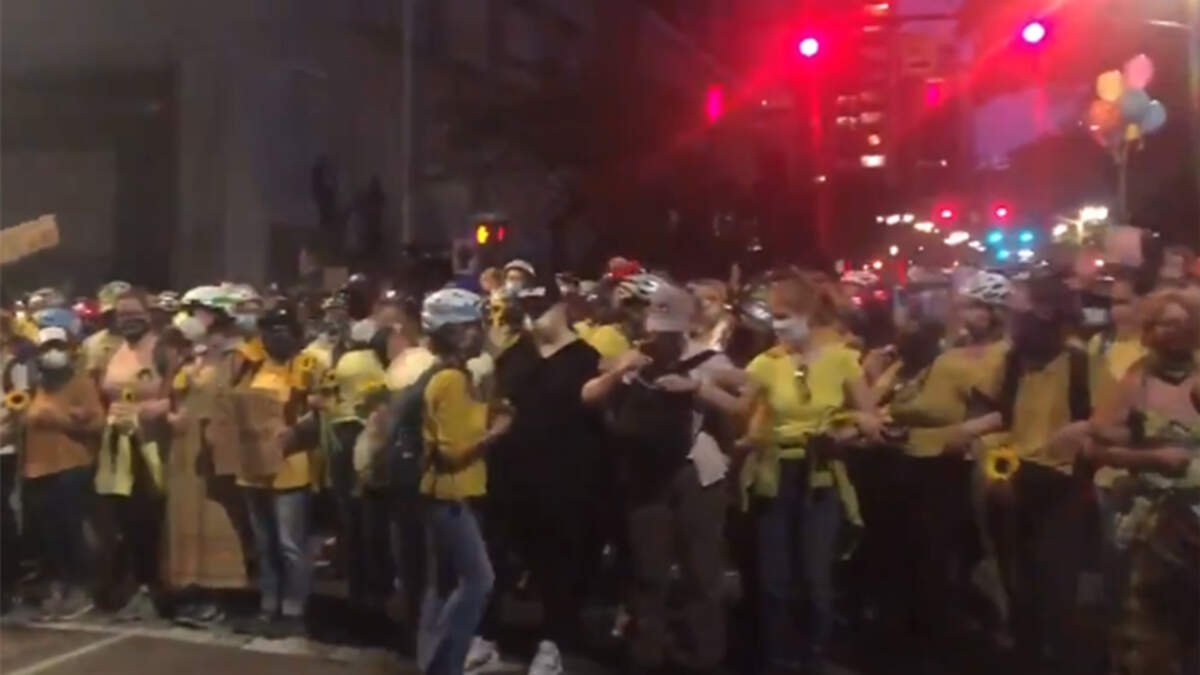 Video from the protests, which have been going on for more than 50 days, shows the group of women linking arms and chanting, "Moms are here, feds stay clear."