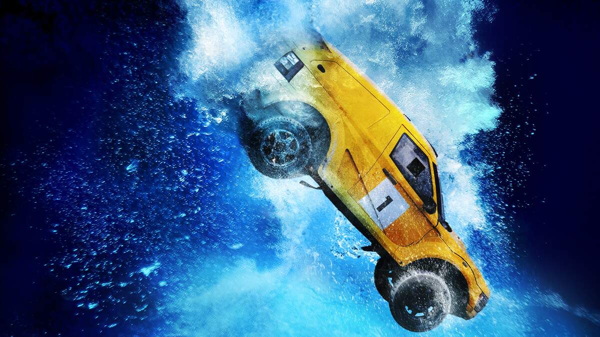 A photo shows the white SUV almost completely submerged in the pool. Structures around the pool are damaged, as well.