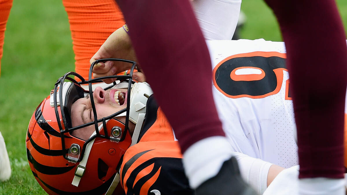 Washington defenders Jonathan Allen and Montez Sweat sandwiched Burrow after he threw a pass intended for Tyler Boyd. Burrow's knee bent awkwardly as his body was crushed between the two linemen. Burrow grabbed at his left leg and appeared to be in immense pain as trainers attended to him on the field.