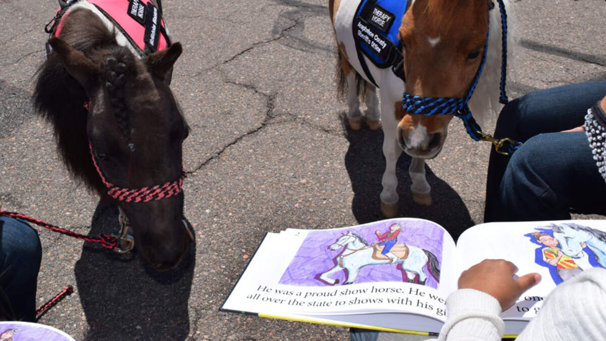 The students gathered in small groups and read the book The Happy Police Horse to six horses, including two miniature therapy horses, reports CBS4.