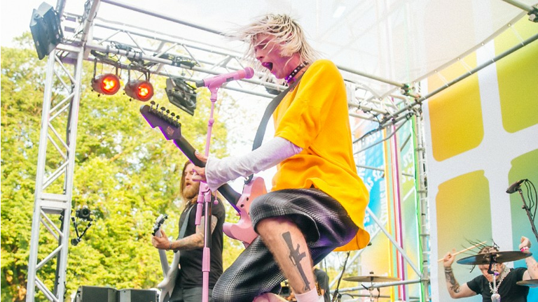 As part of the Bud Light Seltzer Sessions series, MGK brought his hits to the Chicago festival for a 30-minute set, performing tracks from last year’s Tickets To My Downfall, as well as a cover of Paramore's "Misery Business" and his smash, "I Think I'm OKAY." Even though the rap rocker wasn't on the line-up, he did tease the set by sharing a since-expired Instagram Story at an airport in Chicago, Illinois before it all went down. "Read my lips," he captioned the shot, tagging Bud Light.