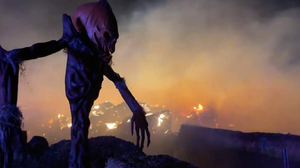 "Heavy equipment such as front-end loaders are working to spread the hay bales in an effort to release heat and expose flames," reporters learned. Unfortunately, the fire destroyed the haunted house located at Flat Acres Farm, South Metro Fire spokesman Eric Hurst says.