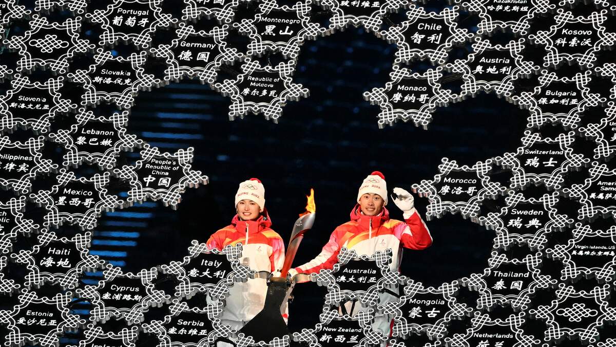 Once all of the countries made their way into the stadium, Uyghur athlete Dinigeer Yilamujiang and Zhao Jiawen carried the Olympic Torch into the stadium and lit the snowflake-shaped cauldron.