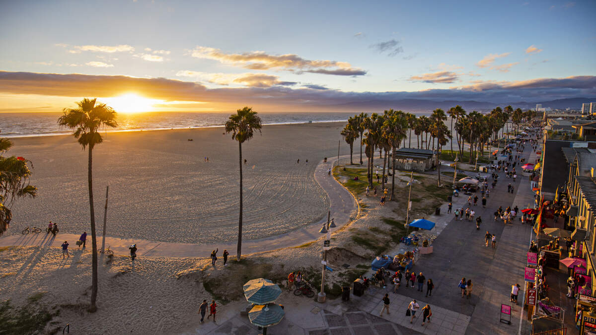 "The two-mile Venice Beach Boardwalk, also known as Ocean Front Walk, is flanked by the beach on one side and restaurants and storefronts on the other side. Hundreds of vendors and street performers populate the iconic paved boardwalk, which is anchored by the Venice Beach Recreation Center, which offers basketball, paddle tennis, and handball tournaments, and Muscle Beach Venice outdoor gym famous for its body builders."