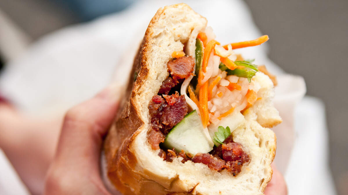 "The bánh mì at Vietnamese joint Lu's Sandwiches packs a flavor punch and is a firm favorite with customers, who especially love the soft yet crispy bread. The baguette is filled with your choice of meat, then topped with fresh cilantro, cucumber, pickled carrots, green onions, house-made butter, and pork pâté. "