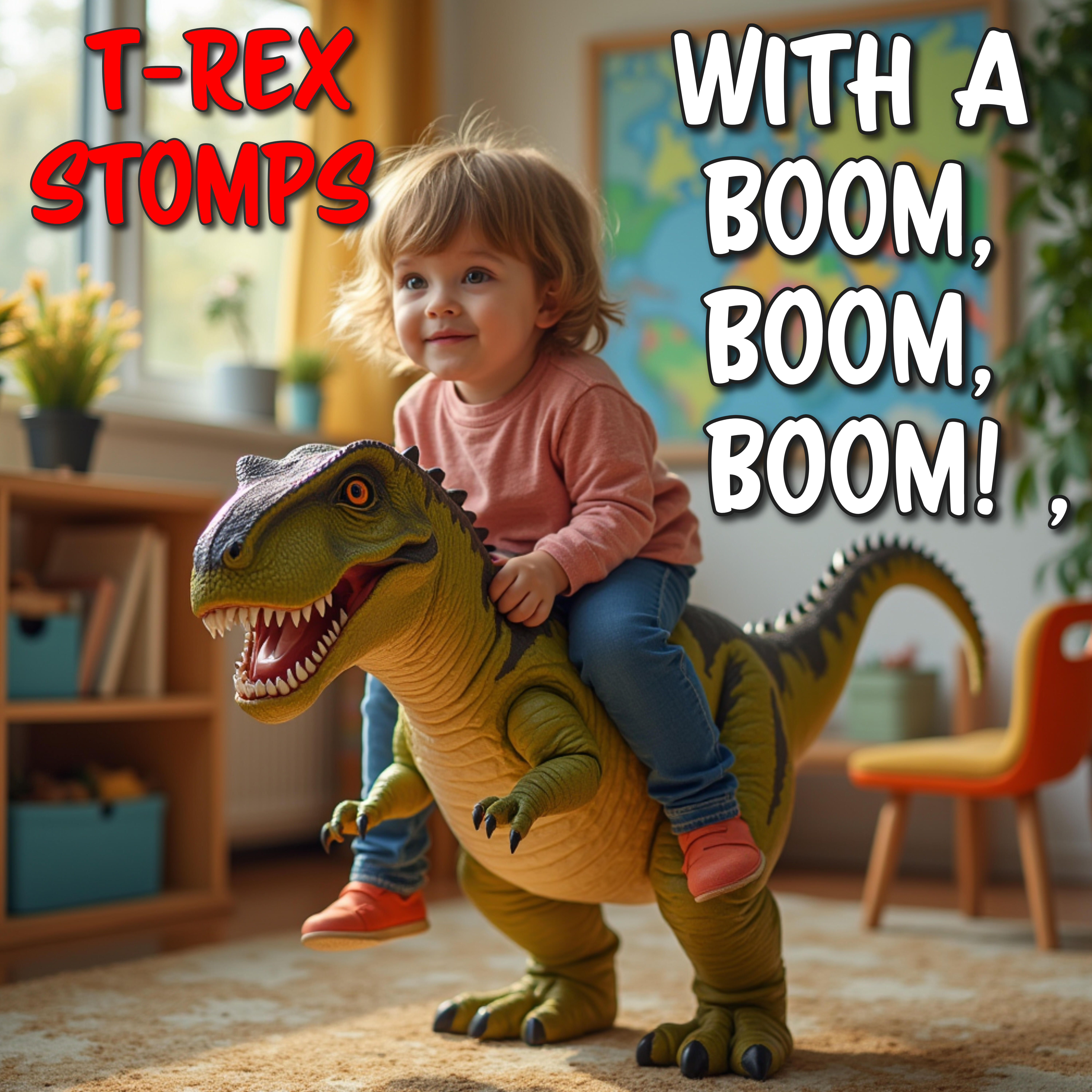 T-Rex stomps with a BOOM, BOOM, BOOM!