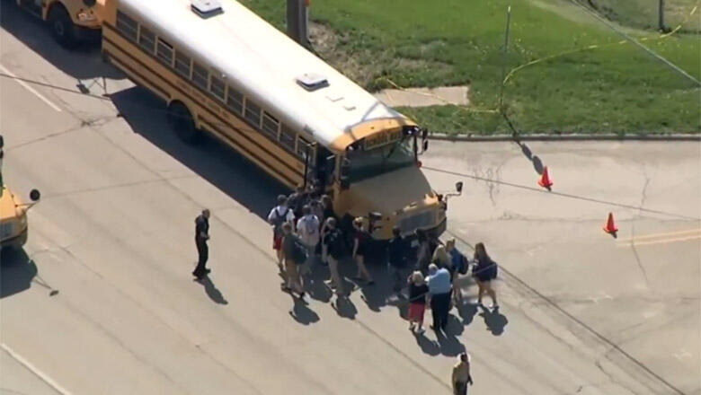 Aerial footage shows students being evacuated from the school and led onto school buses.
