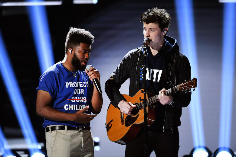 Standing side by side, Khalid and Shawn performed the emotional song, Khalid wearing a t-shirt with the words "Protect our children" on it (the word "guns" is crossed out). And Shawn, as well as the MSD choir, wore Shawn's official "Youth" merch, which proceeds for go to March For Our Lives.