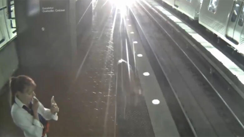 In the video, taken from surveillance cameras at the Crystal City Station, the deer can be seen running on the tracks as a train slowly pulls into the station. One man was so busy looking down at his phone that he didn't notice as the animal jumped onto the platform. When he finally looks up to check on the approaching train, he noticed the deer and slowly backs away as it bolts across the tracks.