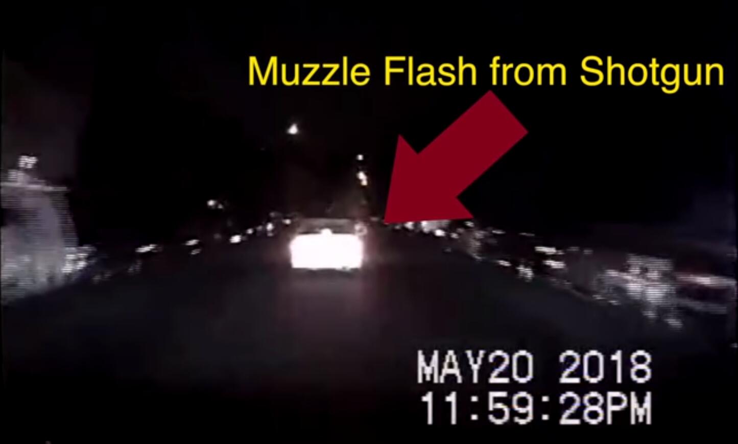 The video begins with the two officers chasing a stolen car just before midnight when one suspect cam be seen firing a shotgun out the passenger window of the vehicle.