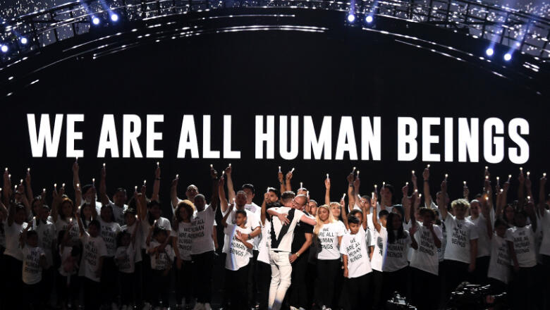 For the immigration-themed set, Logic, and Ryan brought out dozens of families affected by President Trump’s border policies. The performance began with Logic walking out with children wearing "We Are All Human Beings" t-shirts while he wore a shirt that read "F*** The Wall." Midway through the set, a screen rose, reuniting the children with their families, a touching moment no doubt meant as a call to action. The families on stage were made up of immigrant leaders from United We Dream, the National Domestic Workers Alliance, and Make the Road New York, and their children.