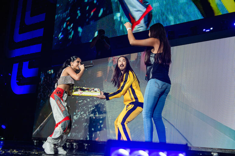 Before she hit the stage with Steve and Becky, she said, "I'm so excited because I'm about to get caked by Steve Aoki. I'm so scared, I don't know what's gonna happen. I also kinda wanna eat some cake, not gonna lie."