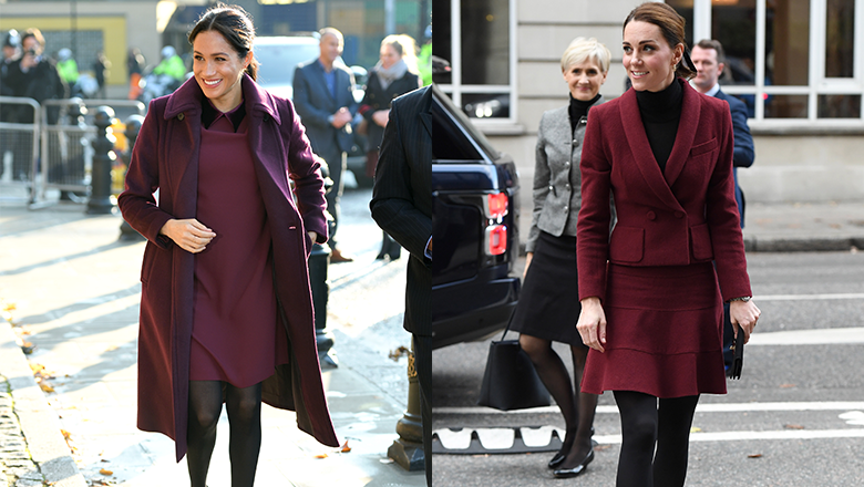 Did our favorite Duchesses color coordinate their royal wardrobes? It sure looks like Kate Middleton and Meghan Markle planned out matching burgundy outfits for their solo royal outings today (Nov. 21), though we'll probably never know for sure if they swap texts about their wardrobes.