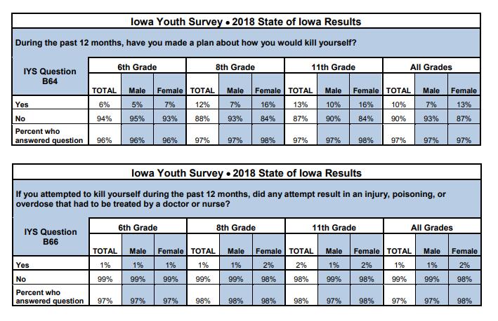 DES MOINES, Iowa - 10-percent of Iowa teens say they have a plan for suicide, in a new survey by the Iowa Department of Public Health. One-percent say they needed medical treatment for an attempt.