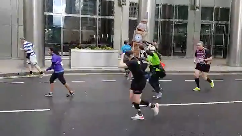 It was all caught on camera and posted to Twitter with the caption, "Hilarious Big Half scenes this morning when a bloke dressed as Big Ben hadn't factored in his additional surface area when trying to run through the Canary Wharf wind tunnel. Time standing still."