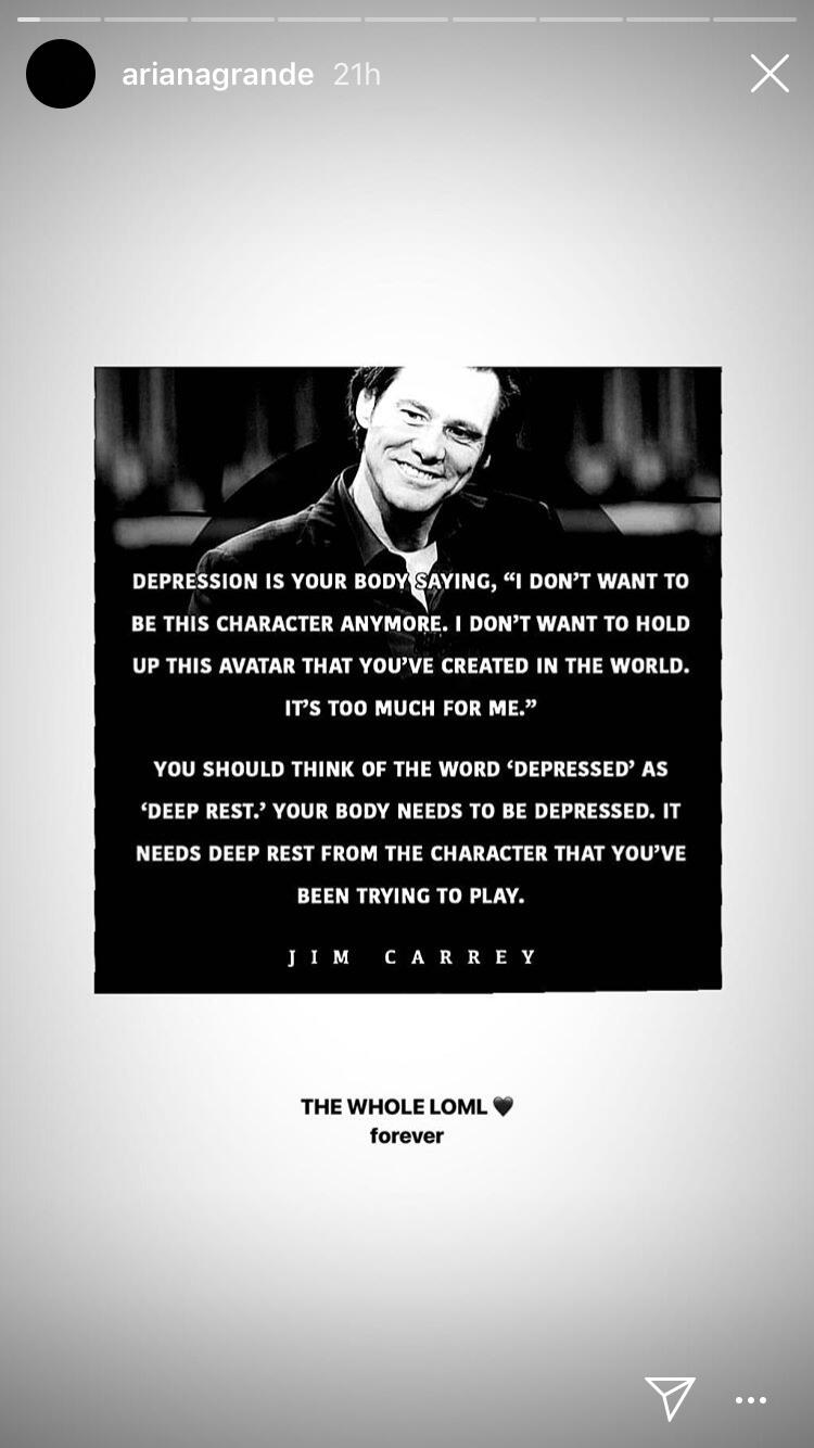 The pop star shared a series of posts on her Instagram story, beginning with a quote written by Carrey explaining depression and how to understand it.