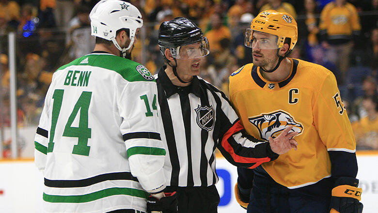Veteran NHL referee Wes McCauley was scolded by the captain of the Dallas Stars after he used some colorful language during game five of the Stars' playoff series against the Nashville Predators. McCauley was talking to Predators forward Filip Forsberg during a stoppage in play and told him: "I'm going to have a talk at the timeout. I've got one hundred f***ing things going on."