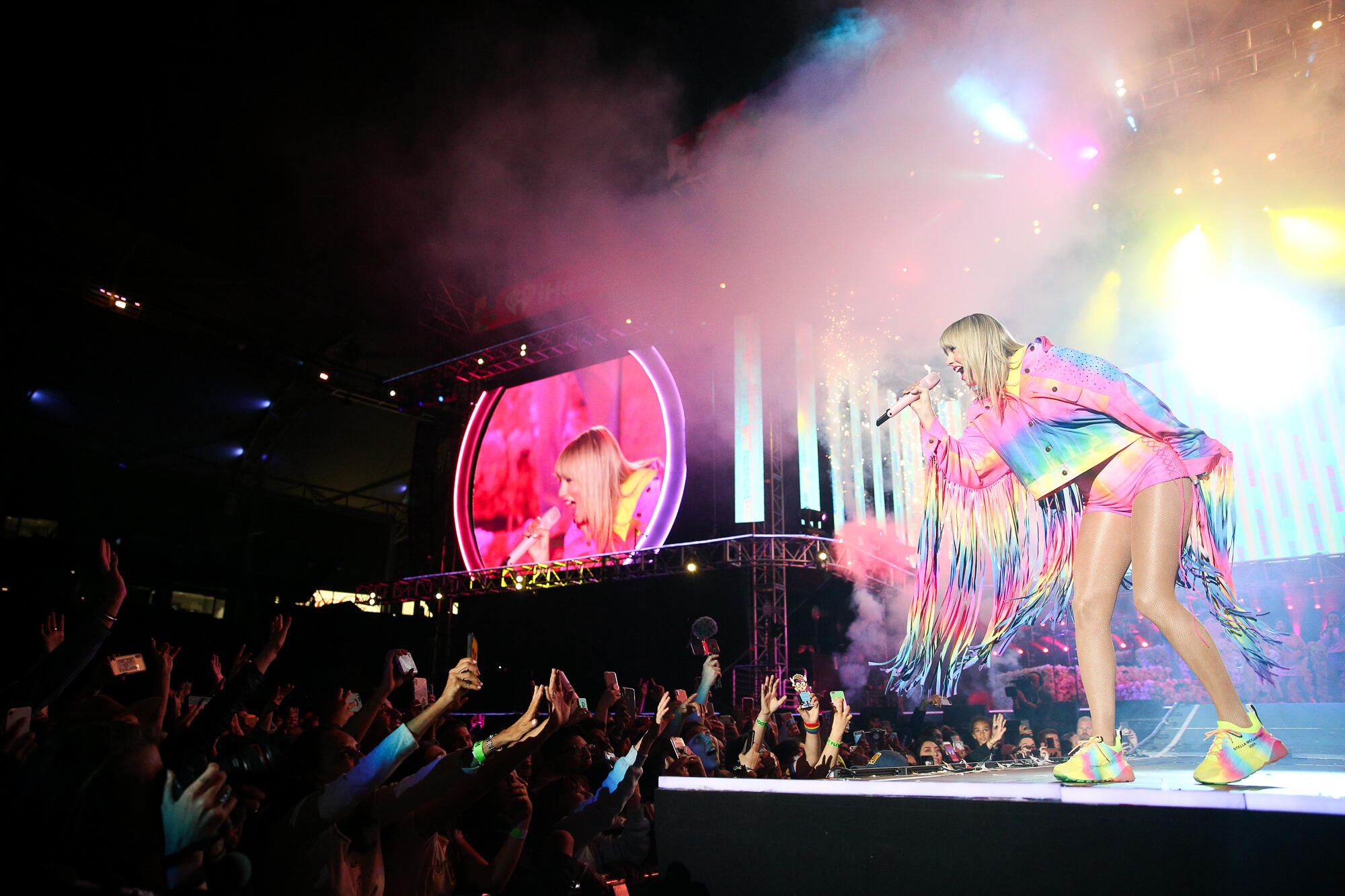 The “ME!” singer donned a rainbow-print fringe jacket with matching high-waisted lace-up shorts and equally sunny sneakers. Halfway through the performance — during which she delivered “Shake If Off,” “Blank Space,” “Trouble,” “Love Story,” “Delicate,” “Style,” “We Are Never Ever Getting Back Together” and Brendon Urie collab “ME!” — she ditched the fringe jacket for a yellow cropped T-shirt.
