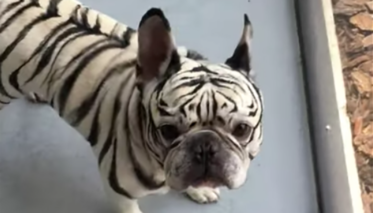 When a sibling is upset, most people resort to hugs or maybe a joke to cheer them up, but what one makeup artist and body painter did puts them all to shame. The cosmetics genius used their skills to transform a French bulldog named Loki into a totally different species. Using a white Siberian tiger as inspiration, the makeup artist turned the pup into a much fiercer animal, just to, as they wrote in the caption of the YouTube video featuring their creation, "bring a smile to her face." They wound up bringing a smile to a lot more people's faces too.