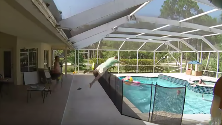 Just last week, security cameras captured a mom saving her kid from probable disaster when the child fell off a balcony, and now there is a new video of another hero parent. Albert Passavanti was enjoying some time poolside with friends in Florida. A four-foot high fence surrounded the water so that Albert's one-year-old son Rocco would be safe. However, other people in the pool likely left an opening in the movable fence and when little Rocco spotted an oversized ball floating in the pool that he wanted to play with, he was able to get to it. When Rocco tried to grab it, he fell in.