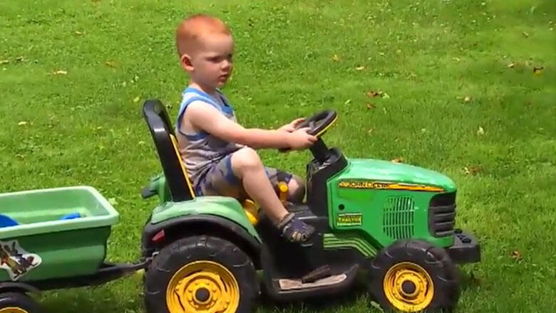 Toddler Drives His Battery-Powered Toy Tractor To County Fair