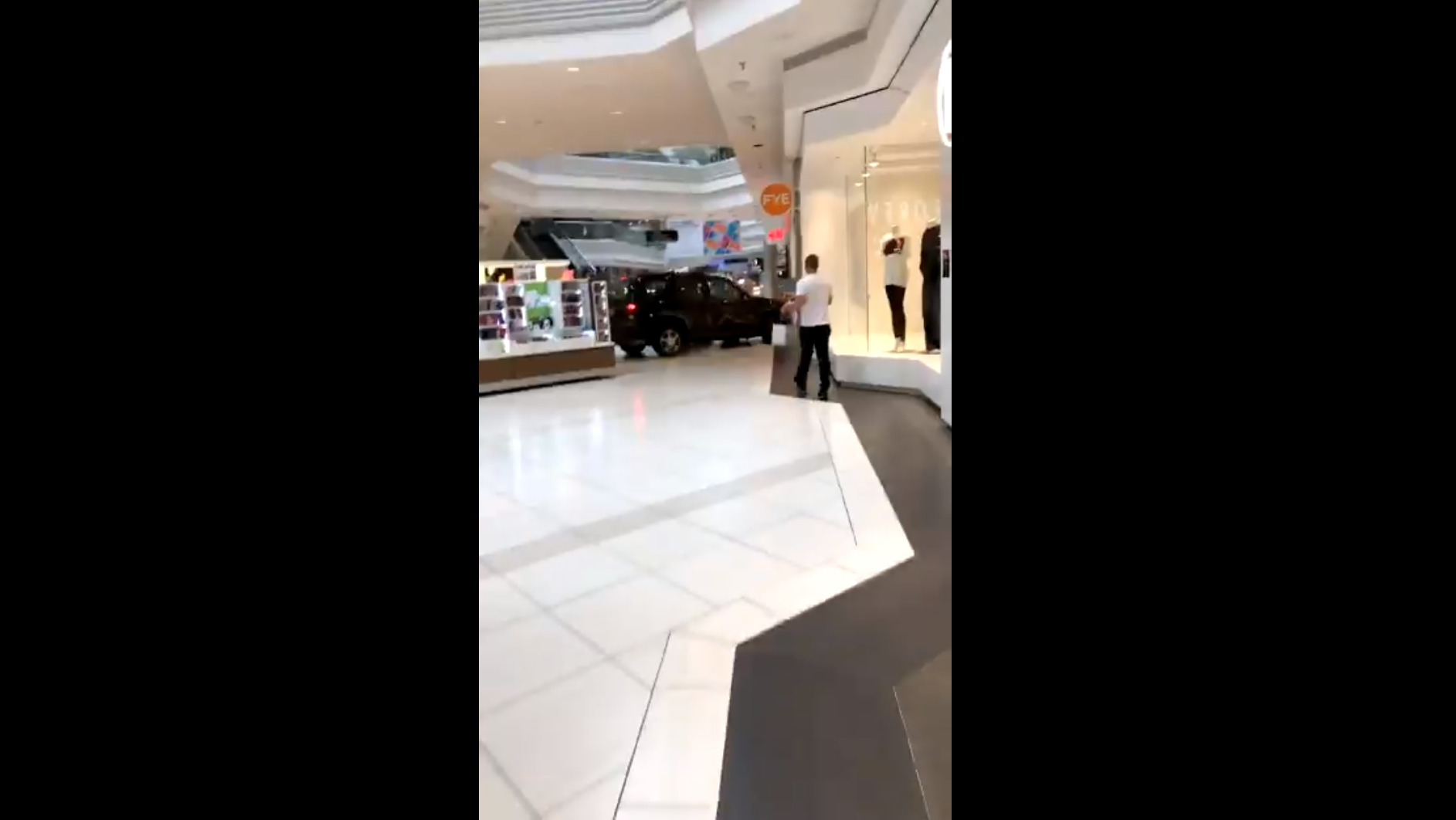 The incident occurred at the Woodfield Mall in Schaumburg, Illinois around 2:30 p.m. Friday afternoon. Video posted to Twitter showed the joyriding driver smash through several kiosks on the ground floor as shopper can be seen running for their lives.