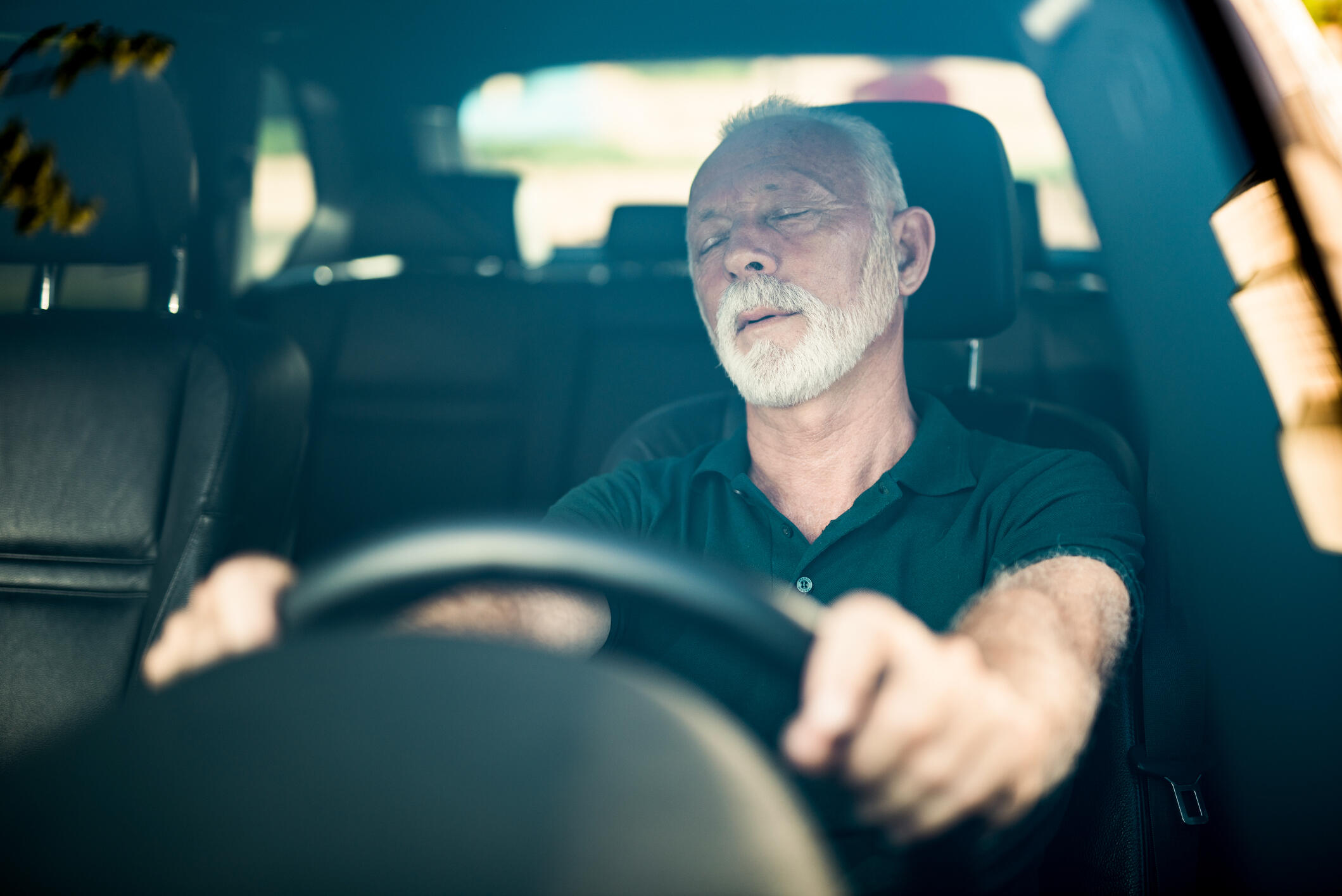 The clip shows dashcam footage from a pair of men, traveling on a highway seemingly on a road trip. The guy riding shotgun is asleep while an older man is behind the wheel. He yawns and opens his eyes wide in an effort to stay awake, but eventually succumbs to his fatigue. Seconds later, the car veers onto the rumble strip then bumps into the median, waking both men with a start.