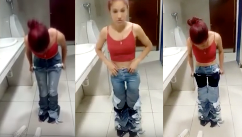 While some shoplifters just throw items in their bag and don't pay for them, others try to get away with their stolen goods in more unique ways. That's what one woman attempted to do but was caught, and the video of her ingenious method is going viral. The incident is believed to have happened in South America and the wannabe thief involved is rumored to be Venezuelan. The clip shows her removing a pair of jeans that she tried to walk off with by wearing, but it doesn't end there. Under that first pair of jeans is another, then another, then another and more. In fact, remarkably, she is wearing nine pairs of jeans but only owned one of them. The guards filming her removing the pants count as she brings down each pair. When she reaches the last set, she shows her underwear underneath to prove there isn't anything else on.