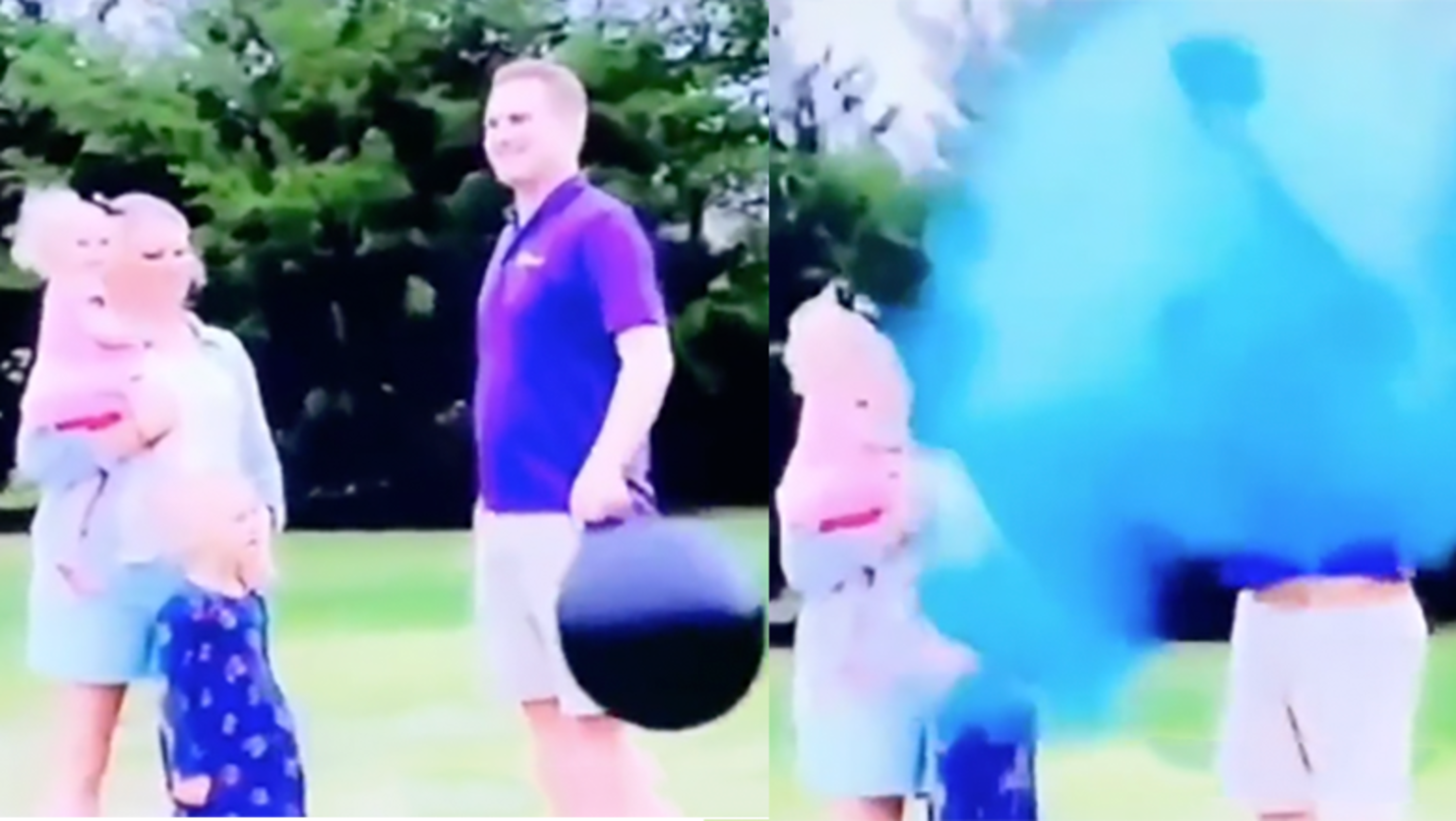 The clip shows a happy family at a gender reveal party getting ready for the big moment. Mom holds one child while her oldest, at maybe four years old, stands in front of her as they all wait for dad to pop a big balloon filled with either pink or blue powder. However, when the father punctures the balloon, there's a small cloud of blue but the majority of the massive amount of powder that was in the inflatable drops on his oldest child, covering her in cobalt.