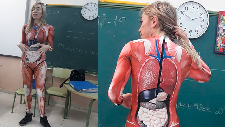 The 43-year-old third grade teacher in Spain is going viral because of how committed she is to helping her students learn. When it came to a recent anatomy lesson, rather than pointing at pictures of where organs are in the body, Duque came into her classroom in a full body suit. Her proud husband tweeted out photos of his wife teaching in the suit and they've gone viral.