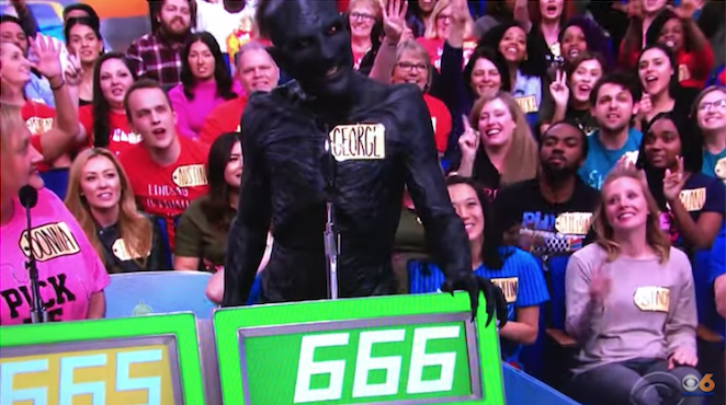 Some people watching The Price Is Right earlier this week were left pretty confused when a demon not only appeared on Contestant's Row, but he bid $666, an appropriate number because of its association to the devil. The man, who had what looked like charred skin and sharp claws, wore a name tag with "George" written on it. A contestant named Donna bids $665 before him and host Drew Carey asks for "George's" bid, which he delivers in a sinister voice. Then, the camera immediately cuts away.