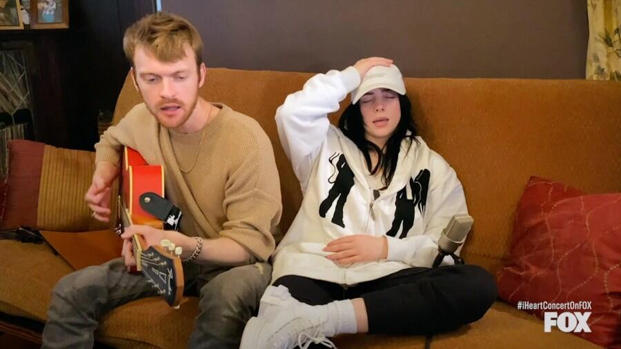 During the number, alongside her brother/right-hand producer FINNEAS on guitar, the two lounged comfortably on what's presumable the couch they've had for years to deliver the pop anthem. Instead of Eilish's usual energetic performance of the track, the superstar put her vocals at the forefront as she delicately crooned to the song besides a cabinet of family photos and record vinyls. "We wanted to thank iHeart and FOX for letting us be some sort of comfort in this crazy, crazy time," the pop titan told viewers at the top of the number. "Love to you, your families, your loved ones, everybody. Let's stay strong together. Love you. Take care."