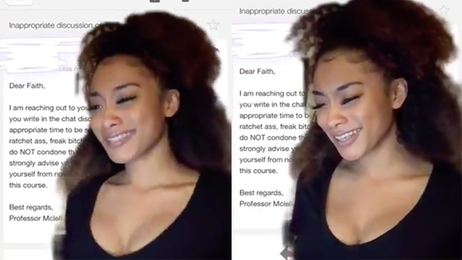 "Dear Faith, I am reaching out to inform you that I can see everything you write in the chat discussion. My class session is not the appropriate time to be sending messages like 'I'm a bougie a**, rachet a**, freak b***h...' It's very disruptive to the class and I do NOT condone this kind of behavior during my lectures. I strongly advise you to keep the inappropriate comments to yourself from now on or else it will jeopardize your final grade for this course."