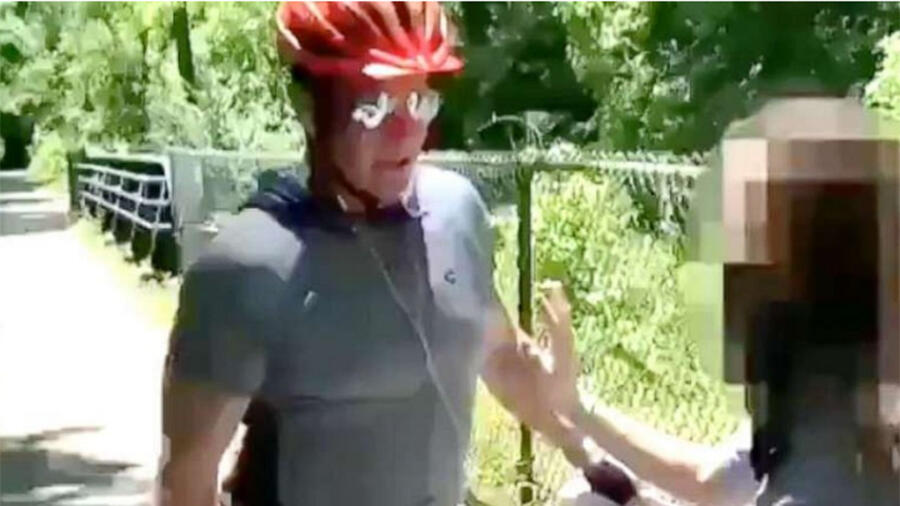 The man ignored their cries and forcibly ripped the signs out of the girl's hands before going after the person filming. He picked up his bike and charged towards the man who was recording, knocking him to the ground. The cyclist then rode off, and nobody was hurt.