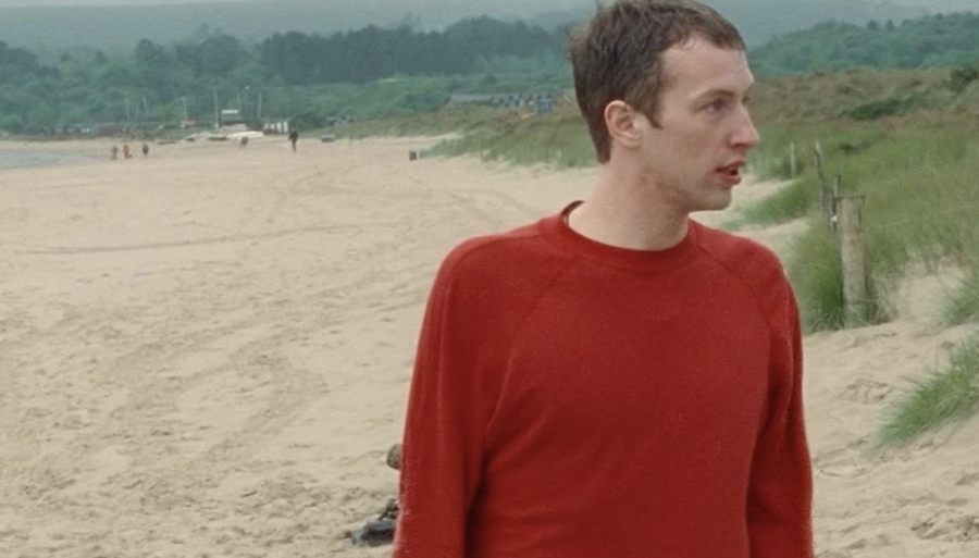 We can all picture the iconic visual of Martin singing on a rainy, secluded beach — drenched and dressed from head to toe in rain gear; however, the day didn't start off wet and soggy. The previously unreleased clip shows Martin walking barefoot (!!!) in the sand, wearing a red sweater and cuffed jeans. And that abandoned beach is littered with people.