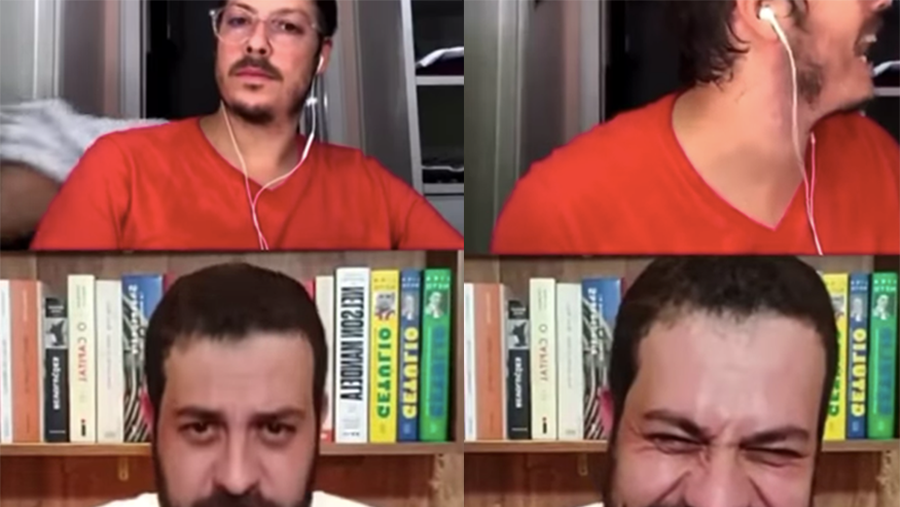 Fabio Porchat was hosting his Instagram show, Politics Live, interviewing former Brazilian presidential candidate Guiherme Boulos when Porchat's wife tried to sneak past the shot wearing only a towel on her head. She did not go unnoticed.