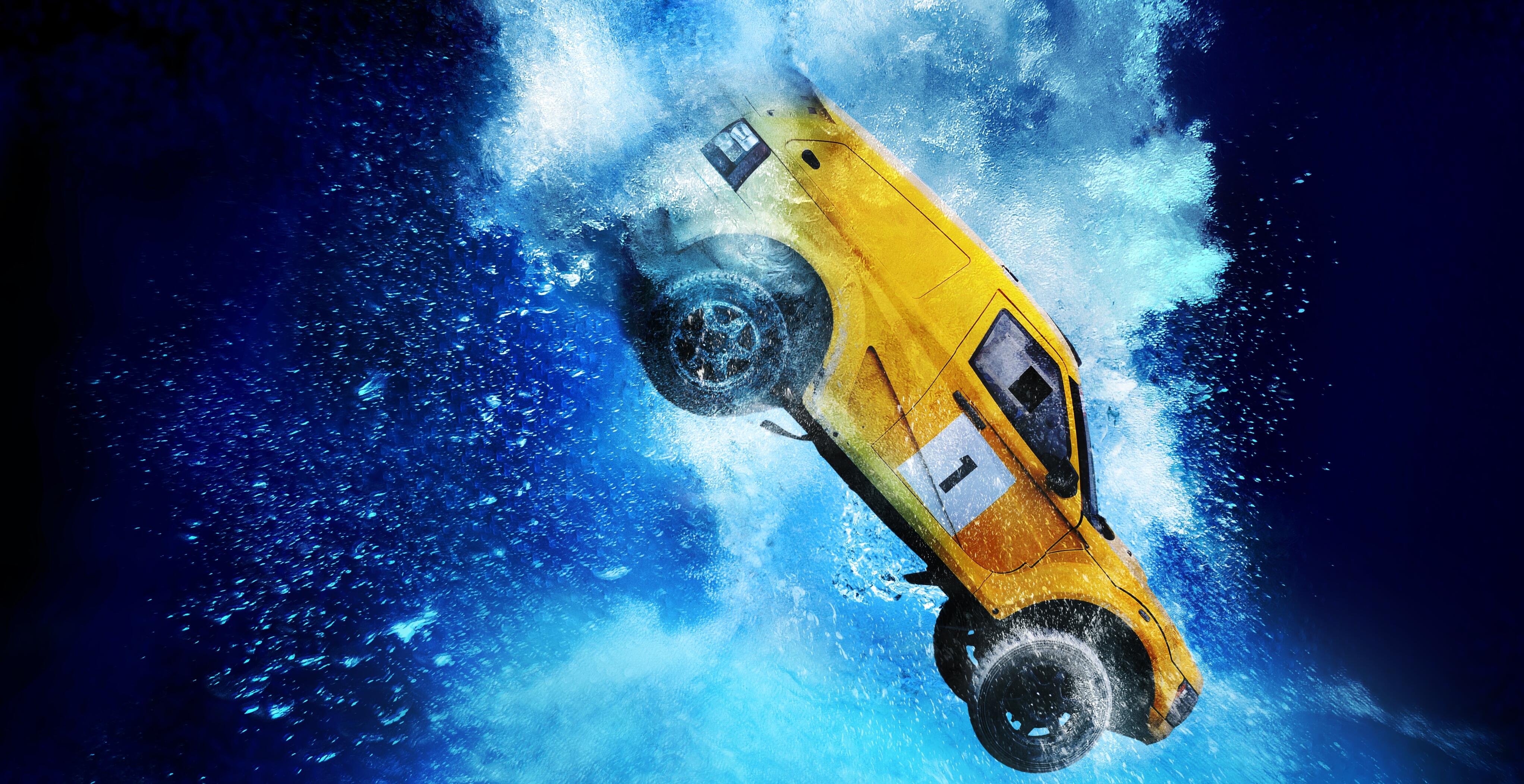A photo shows the white SUV almost completely submerged in the pool. Structures around the pool are damaged, as well.