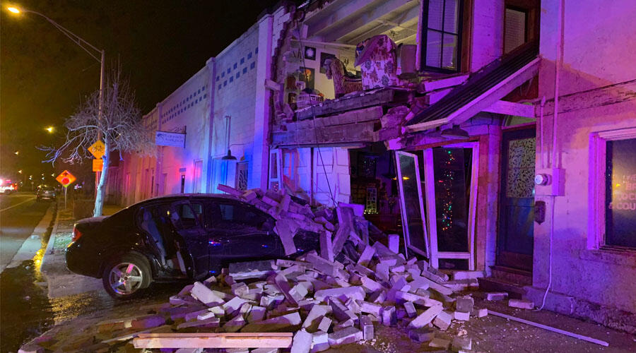 The crash occurred at the 200 block of South Main at 8:15 P.M. bringing down a majority of the wall to the second story of the building.