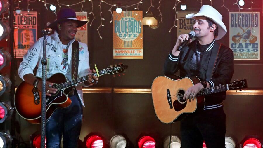 Halfway through the show, which was hosted by Keith Urban and Mickey Guyton, Allen appeared for his remote performance of his latest single, "Freedom Was a Highway," from Nashville's Bluebird Cafe. Yet, little did he know his song collaborator Brad Paisley was going to join him for the three-minute cut at the venue's mini-stage. "My duet partner Jimmie Allen ... is about to sing our new duet 'Freedom Was A Highway,' but he thinks I'm out of town," Paisley told the camera with a smile. "So I have driven up here and I'm gonna surprise him and go in and just start singing."