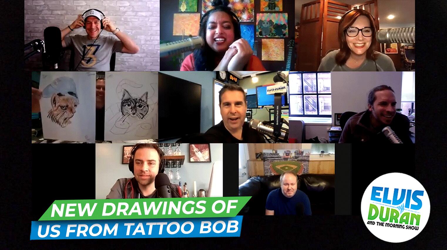 Last time we shared these drawings, our friend and long-time listener, Tattoo Bob, came on the show and shared these cartoon drawings he did for everyone on the show! Now he has come back with updated drawings including ones of Elvis' dogs Max and Ollie as well as Danielle's bearded dragon and cat!