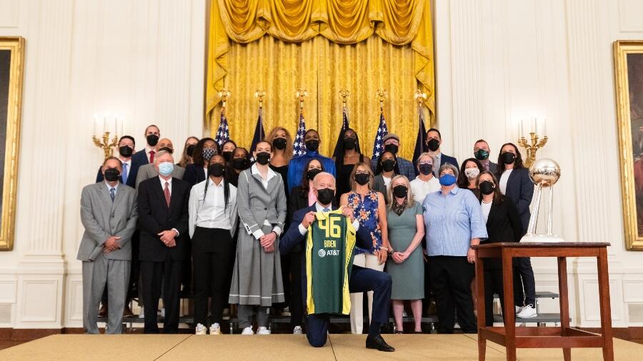 At another point in the ceremony, the Seattle Storm organization presented Biden with an honorary jersey. The President later kneeled in front of the team with the gift for a photo op.