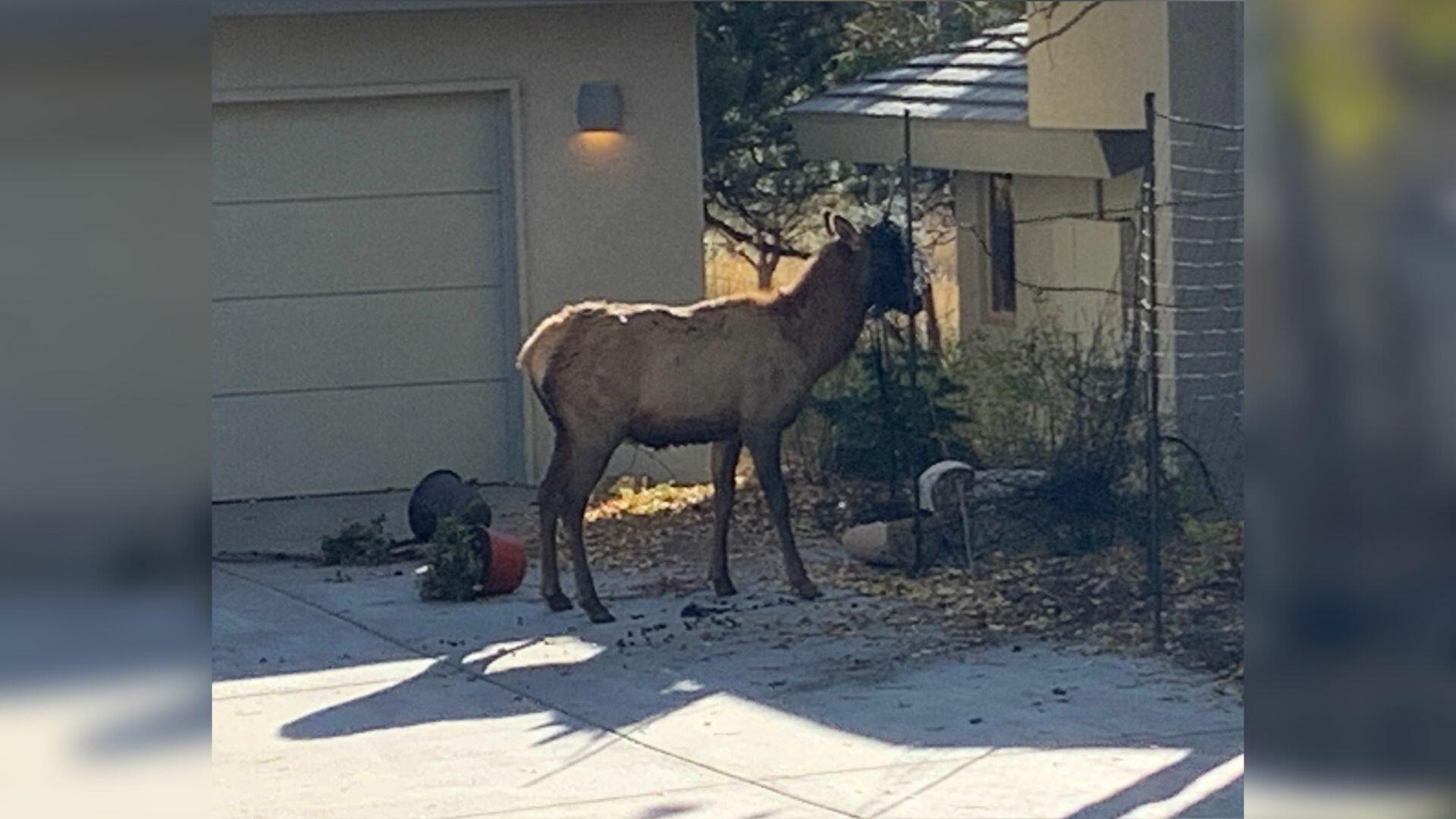 Wildlife officers responded to the scene and were able to tranquilize the bull elk to free it from the entanglement. They also snapped photos of the black netting bundled around the elk's face and growing horns. Some potted plants were also kicked over and broken at the scene. Another picture shows the elk laying down after it was sedated.