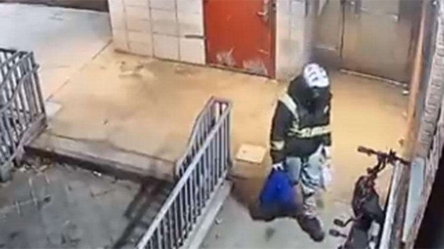 Authorities in New York City are searching for a suspect who disguised himself as a delivery worker and killed a man as he opened the door to his apartment. The New York City Police Department released surveillance footage of the man, who was wearing a black jacket and a reflective vest, parking his bike outside of an apartment building in lower Manhattan.