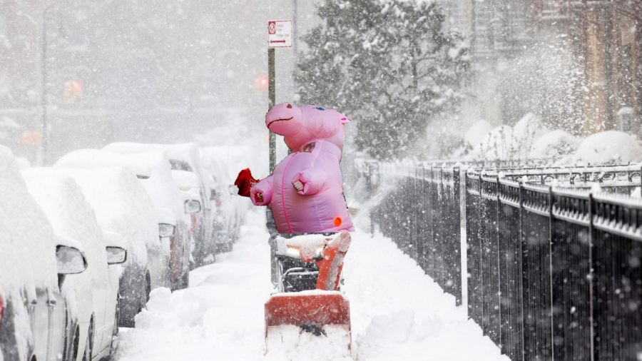 According to News 5 Cleveland, a neighbor on Lakewood's Wagar Avenue in Northeast Ohio was dressed in a bright pink inflatable unicorn costume while snow blowing the street's sidewalks.
